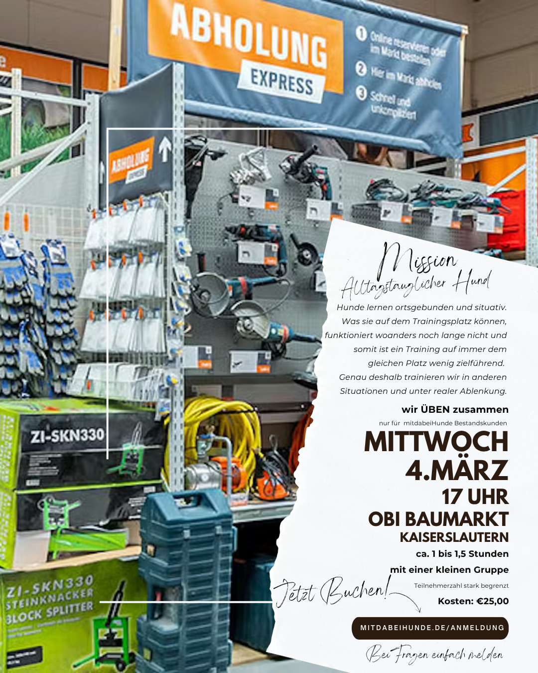 Ein weiterer Termin aus der ‚Wünsch-dir-was-Gruppe‘ zum Thema alltagstauglicher Hund MitdabeiHunde im Baumarkt OBI Kaiserslautern mit dem Fokus auf die Themen: Dabei sein und nicht auffallen ... und wenn, dann nur im positiven Sinne Hunde lernen ortsgebunden und situativ. Was sie auf dem Trainingsplatz oder im gewohnten Umfeld leisten können, funktioniert woanders noch lange …